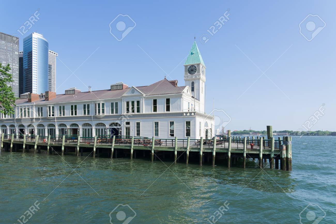 New York Ny Usa June 06 2015 Pier A Harbor House With Restaurant Situated On The Hudson River At Battery Park Lower Manhattan Modern Skyscrapers In The Background Blue Sky Stock